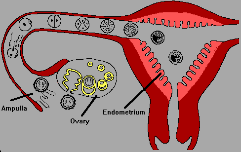 After ovulation the oocyte is gathered from the abdominal cavity by the fimbriae. Fertilization takes place in the ampulla after which the zygote migrates to the uterine cavity. The zygote takes about seven days to reach the uterus. Meanwhile it develops into the blastocyst The blastocyst implants into the endometrium