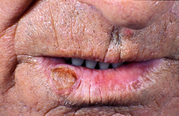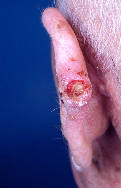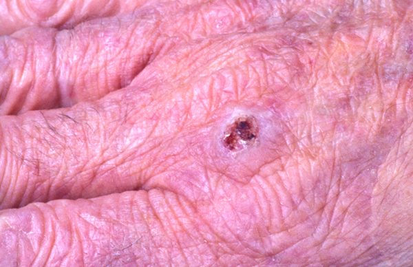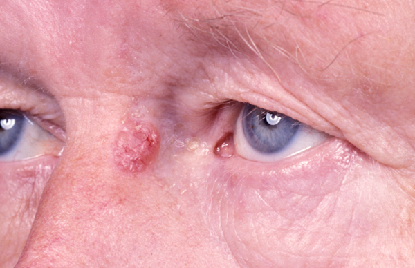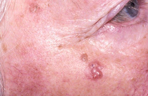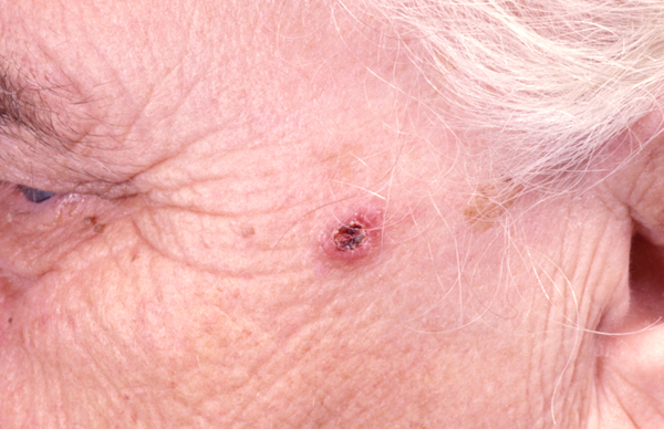 bijgaande 6 klinische plaatjes ziet u 6 keer een huidcarcinoom bij een oudere.